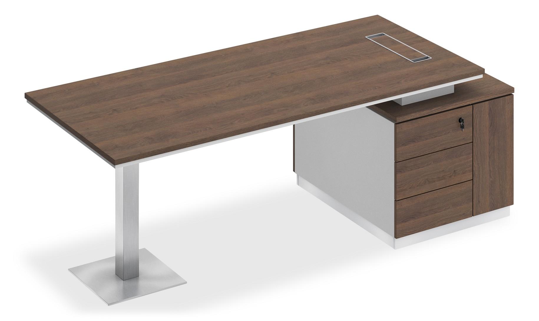 Стол состоит из столешницы, заглушки кабель-канала, металлической опоры и опорной тумбы.