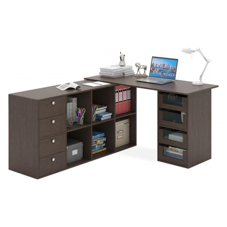 Работа или развлечения – Стол письменный Прайм-83 MAS_STL-PRAIM-83-VM, созданный брендом 2735035, отлично подойдет для выполнения любых задач. Эта модель входит в коллекцию «Прайм-83» и способен подстроиться под нужды каждого члена семьи. Благодаря оптимальным размерам изделия (1396Х1434Х740 мм) вы сможете с комфортом заниматься любимыми и важными делами. Базовая комплектация включает в себя непосредственно письменный стол, тумба: 3 полки, 4 ящика, тумбочка: 4 ящика. Для изготовления корпуса был выбран ЛДСП Е1 в оттенке венге, завершает дизайн матовый верхний слой, гармонично перекликающийся со столешницей. Приобрести данную модель вы можете по привлекательной цене, равной 18798 руб.