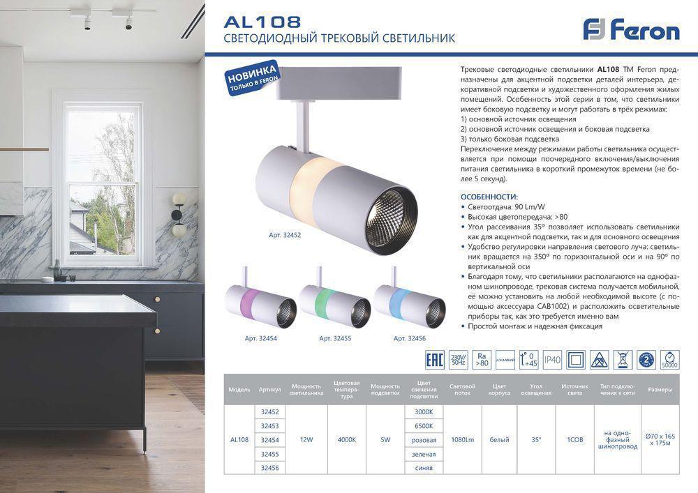 Светодиодный светильник Feron AL108 трековый на шинопровод 12+5W, 35 градусов, 4000К и подсветка 6500К