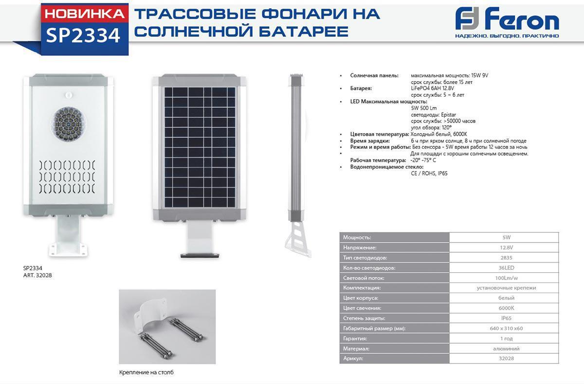 Уличный светодиодный консольный светильник на солнечной батарее Feron SP2334 32028